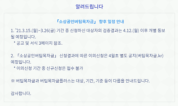 소상공인 버팀목자금 플러스 소개, 신청하기, 신청결과 확인 등