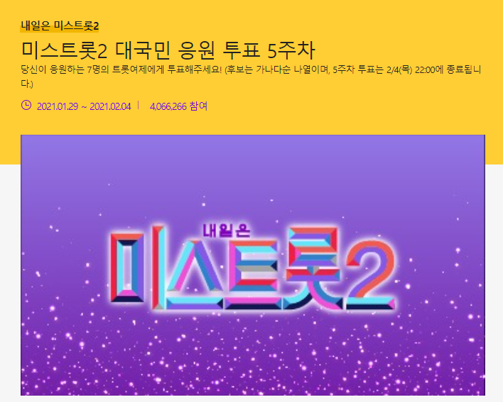 안녕하세요. 미스트롯 2 투표하기 5주차 투표가 진행되고 있습니다. 여러분이 생각하시는 미스트롯 2 진은 누구인가요!!!